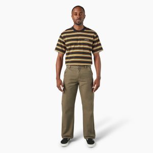 These men’s carpenter pants are built for long-lasting style and utility with their 12oz. 100% cotton canvas construction. The rugged style features a regular fit. straight leg. and a washed finish for softness. The pants are equipped with authentic and functional carpenter details. including a hammer loop. ruler pocket. and metal trims.