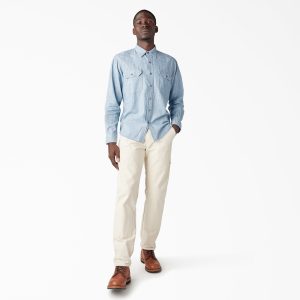 Rediscover a hardworking essential dating back to the 1920s in Dickies 1922 Long Sleeve Work Shirt. While there is nothing basic about this everyday work shirt. you’ll find an excess of vintage styling and purpose in the straightforward construction. Offered in blue and black chambray with khaki contrast stitching. as well as a sturdy ripstop camouflage print with matching stitching to highlight our military heritage. Dickies 1922 Long Sleeve Work Shirt is a go-to closet essential that will stand up to every season. The reinforced triple needle seams ensure superior durability while the 100% cotton fabric from Japan makes this limited-edition work shirt the finest of it’s kind. Vintage reinforcements are found at the bottom of the side seams. while the extra buttonhole on the front placket is placed for a pocket watch fob. highlighting the rich history of this throwback piece. The black melamine buttons are exceptionally tough. offering the finest attention to heritage detailing based on their long-established military strength. Featuring two patch pockets with flaps as well as a pencil division on the left pocket. you’ll achieve authentic workwear styling in this time-honored work shirt.