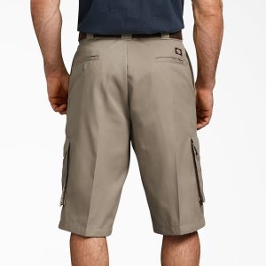 When the heat is on at work. keep it loose with our spacious. flexible Men’s Loose Fit Cargo Work Shorts. 13. The knee-length cut provides stylish longer coverage and optimum comfort. The FLEX fabric helps you stay sharp with a wrinkle-resistant design with an easy-care stain release finish that is easy to care for. Bellowed cargo pockets allow for generous storage. The ample fit is roomy in the seat and thigh. It is easy to wear a heavy tool belt with our signature tunnel belt loops.