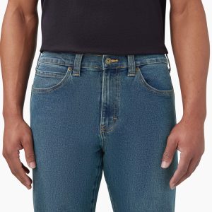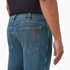Our Men’s FLEX Regular Fit 5-Pocket Jeans are comfortable enough for a tough workday. yet stylish enough to wear any day. Featuring Dickies FLEX. this denim stretches to keep up with every move you make while offering durability you can trust and count on. It’s also constructed with double-needle stitching. and provides a regular fit with a straight leg style. The 5 pockets can help you move through your day with your hands free. And the antique brass button fastener adds a touch of flair.