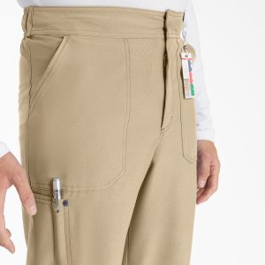 This Men’s fit mid rise pant has an elastic-reinforced waistband with inside logo drawstring for adjustability and security. Pull-on waist with zip fly and logo snap closure. There are four pockets for easy storage: two front slant pockets and two cargo pockets with decorative stitching (right with pen/instrument stitch). Cargo pockets have decorative logo snaps at corners. Decorative knee stitching and decorative stitching on all seams for added styling. Logo locker loop at center back waist for quick hanging.
