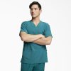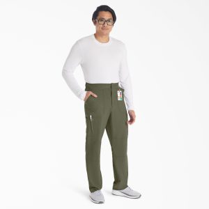 This Men’s fit mid rise pant has an elastic-reinforced waistband with inside logo drawstring for adjustability and security. Pull-on waist with zip fly and logo snap closure. There are four pockets for easy storage: two front slant pockets and two cargo pockets with decorative stitching (right with pen/instrument stitch). Cargo pockets have decorative logo snaps at corners. Decorative knee stitching and decorative stitching on all seams for added styling. Logo locker loop at center back waist for quick hanging.