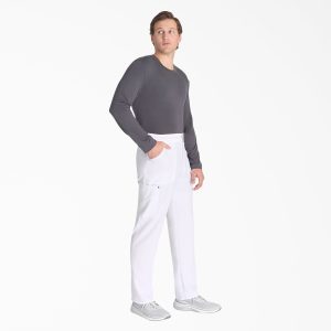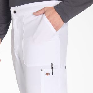 This Men’s fit mid rise pant has an elastic-reinforced waistband with inside logo drawstring for adjustability and security. Pull-on waist with zip fly and logo snap closure. There are four pockets for easy storage: two front slant pockets and two cargo pockets with decorative stitching (right with pen/instrument stitch). Cargo pockets have decorative logo snaps at corners. Decorative knee stitching and decorative stitching on all seams for added styling. Logo locker loop at center back waist for quick hanging.
