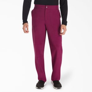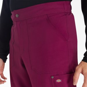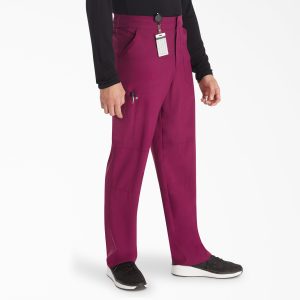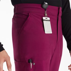 This Men’s fit mid rise pant has an elastic-reinforced waistband with inside logo drawstring for adjustability and security. Pull-on waist with zip fly and logo snap closure. There are four pockets for easy storage: two front slant pockets and two cargo pockets with decorative stitching (right with pen/instrument stitch). Cargo pockets have decorative logo snaps at corners. Decorative knee stitching and decorative stitching on all seams for added styling. Logo locker loop at center back waist for quick hanging.