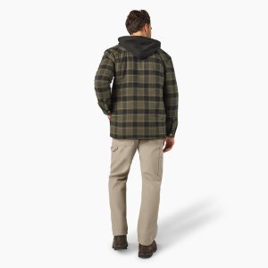 This Men’s Water Repellent Flannel Hooded Shirt Jacket is an outer layer you can rely on. Finished in a classic relaxed fit. the jacket is made with 100% yarn dye flannel with a quilted lining. The durable fabric keeps you warm. yet it is light and breathable. The Durable Water Repellent (DWR) finish makes water bead up and roll off fabric–great for working in a light rain. Store your work gear in the deep front chest pockets. and use the fleece hand-warmer pockets for when the temperature drops. Get the job done in this versatile workwear staple.