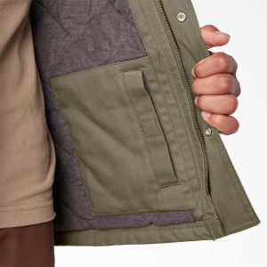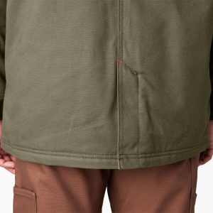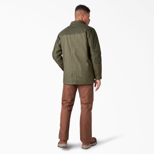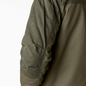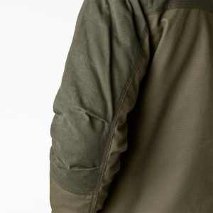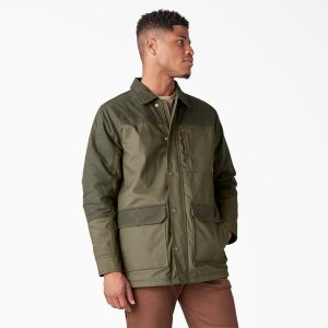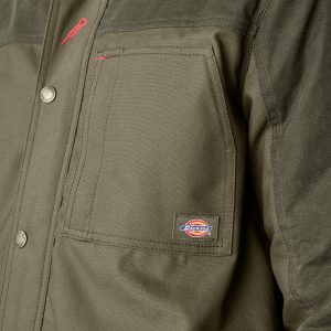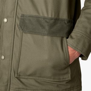 This Dickies Men’s Waxed Canvas Chore Coat has a classic design and a relaxed fit that’s perfect for the workplace. Made of strong cotton duck canvas. the wind-resistant jacket has a wax-coated fabric. with triple-needle reinforced stitching and a Durable Water Repellent finish. The chore coat has a full-zip closure and a snap-close storm flap. You can keep your items secure in the coat’s three exterior utility pockets and a back hem stash pocket.