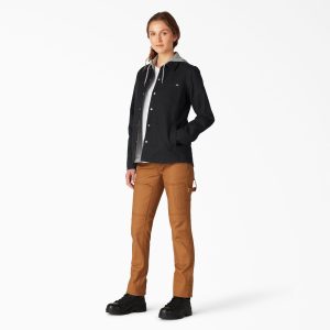 Discover the most versatile outer layer that delivers on the promise of warmth. durability and protection in Dickies Women’s Duck Hooded Shirt Jacket. Combining the lived-in feel of a hoodie. the strength of a duck canvas work shirt and the security of a jacket. this workday essential will check the box for function and style. Featuring a sturdy brushed duck canvas fabrication and equipped with a cozy jersey lining and hood. you’ll embrace the cold climate with ease in this shirt jacket. You’re covered in wet weather too. as the DWR finish ensures water repellency to keep you dry. Durable metal snap closures at front and a drop tail hem offers even more protection when your work climate calls for it. Maximum utility comes standard with two large chest pockets and two side welt pockets to store all that you carry.