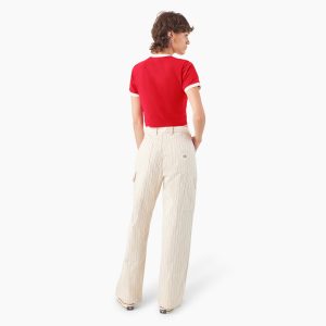 The Lewistown women’s ringer tee features a slim fit. cropped length. and contrasting neck and sleeve ribbing. The t-shirt is crafted from a cotton blend with just enough stretch for comfort. It’s finished with a small script graphic inspired by the Dickies logo for a retro look.