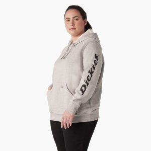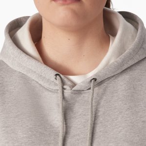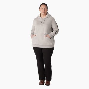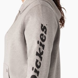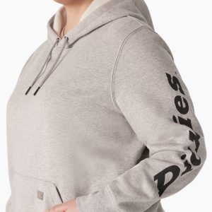 Dickies’ Women’s Plus Water Repellent Sleeve Logo Hoodie is made of fleece. so it feels cozy and comfortable. Yet it’s as strong and durable as you. This plus size hoodie features the same design as our regular women’s hoodie. Double-needle stitching and the Durable Water Repellent (DWR) finish add strength and protection on wet days. The crossover neckline. three-piece adjustable hood. and rib-knit waist and cuffs add strength. durability. and comfort. even in rough weather conditions. Use the front kangaroo pockets to store small work essentials–or just to keep your hands warm. The Dickies Wordmark graphic logo adds style.